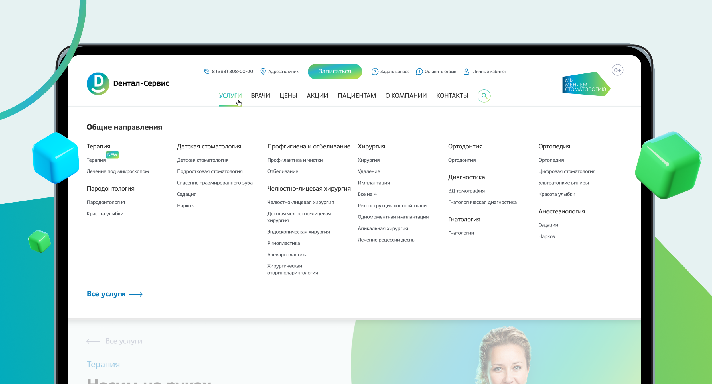 Чтобы подчеркнуть инновационный уровень услуг клиники, мы предложили разделить весь портфель на категории: «Супертехнологии» и «Общие направления». Такое деление подчеркивает преимущества «Дентал-Сервис» на региональном рынке и делает навигацию более удобной для пользователей.