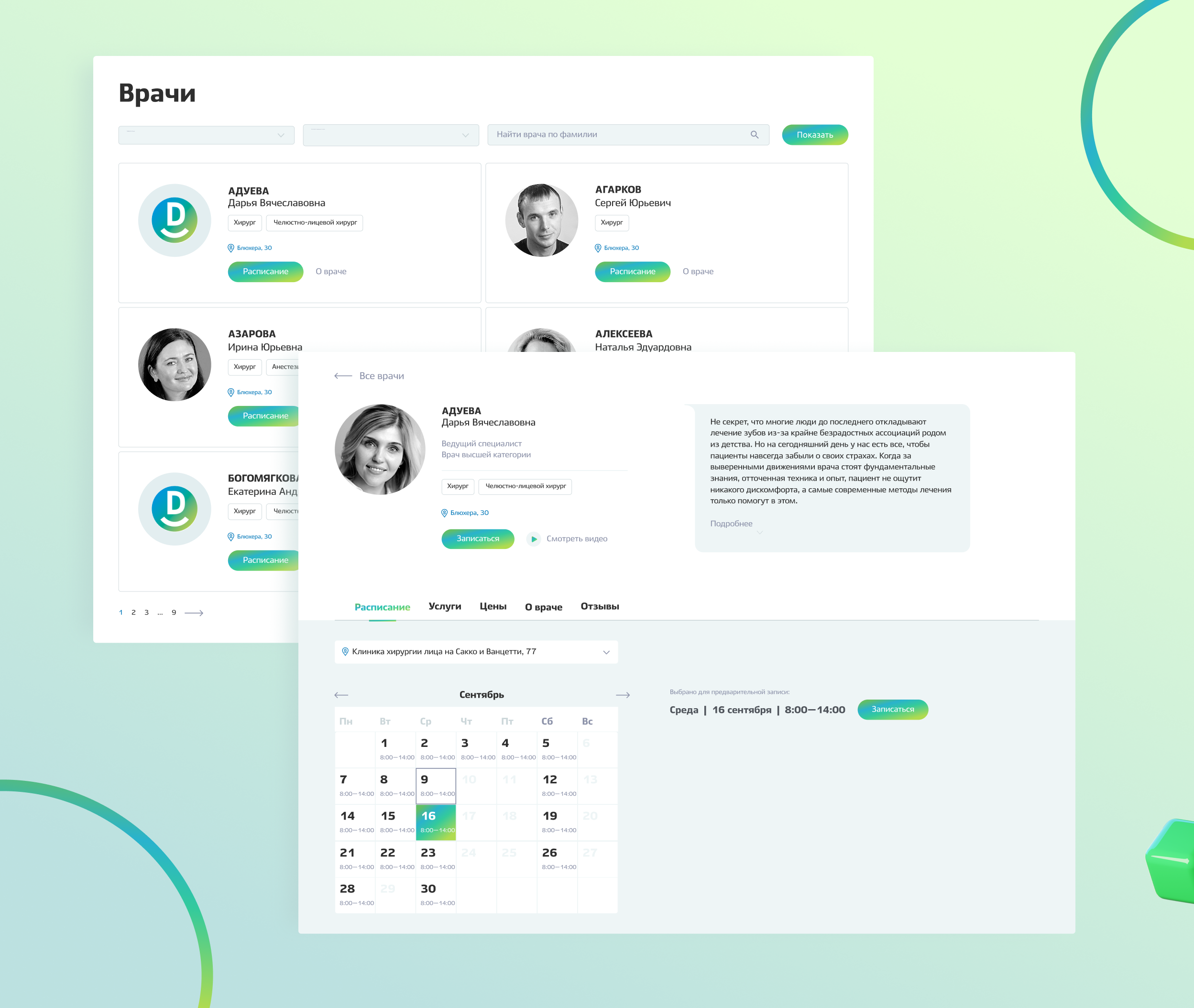 Карточка врача содержит фото, описание, специализацию и расписание. Встроенный календарь позволяет выбрать дату и сразу записаться к нужному врачу. Благодаря интеграции с медицинской системой «Инфодент» информация всегда актуальна.